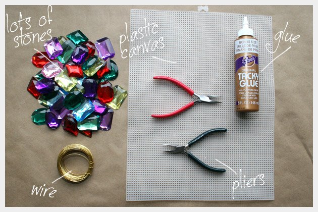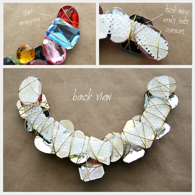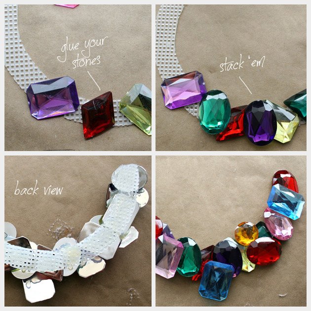 Comienza pegando las piedras en la lona de plástico. Mezcla los colores y formas y ve encimándolas unas con otras, hasta que esté todo lleno. No llenes el círculo entero. Se recomienda sólo hasta la mitad del circulo de otra forma se pondrá demasiado rígido y no podremos ponerlo alrededor del cuello.
